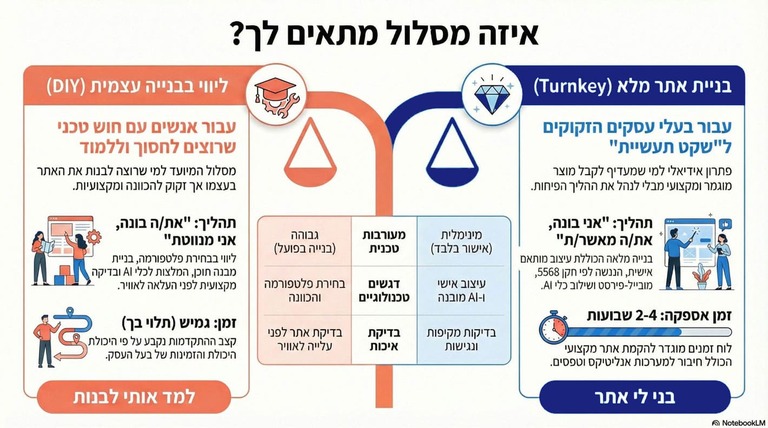 בנה יחד איפיון מסודר: מה האתר צריך לעשות, איזה תכנים יהיו בו, ואילו אוטומציות ו‑AI יכולים לחסוך לך זמן.